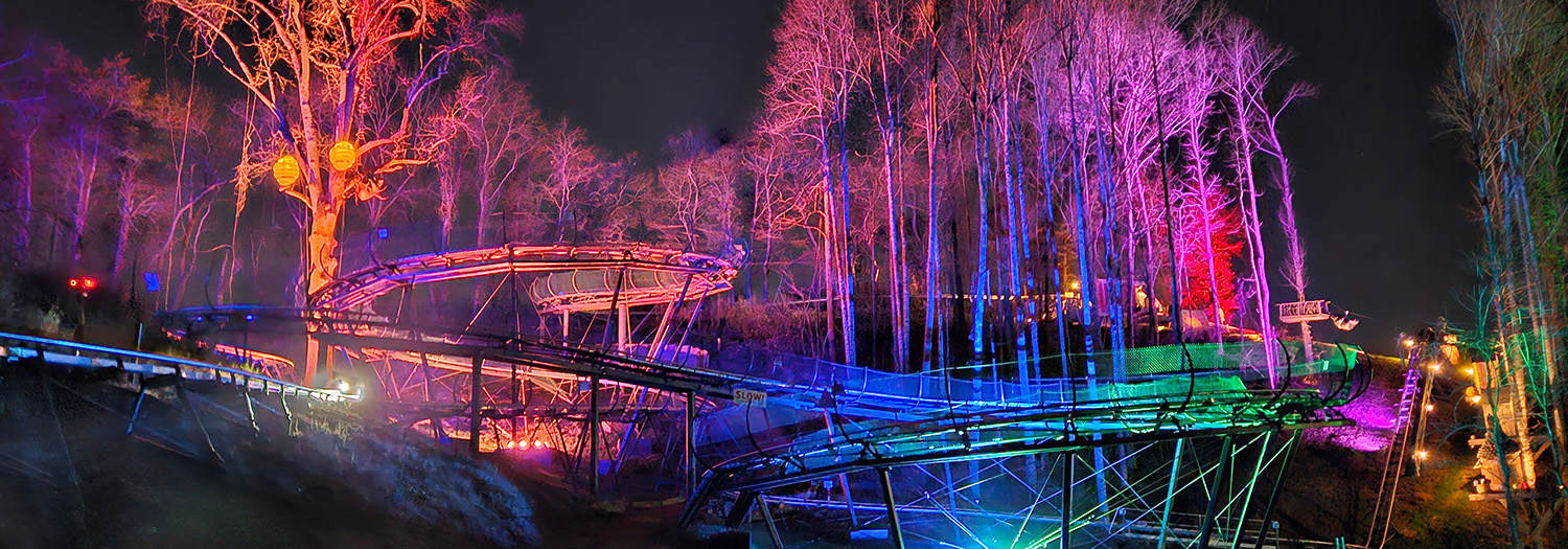Luminous Terrain™ is a large, interactive, outdoor, nighttime lighting experience, where intelligent moving lights interact with your guests, immersing them in color and patterns to create fun family entertainment.