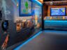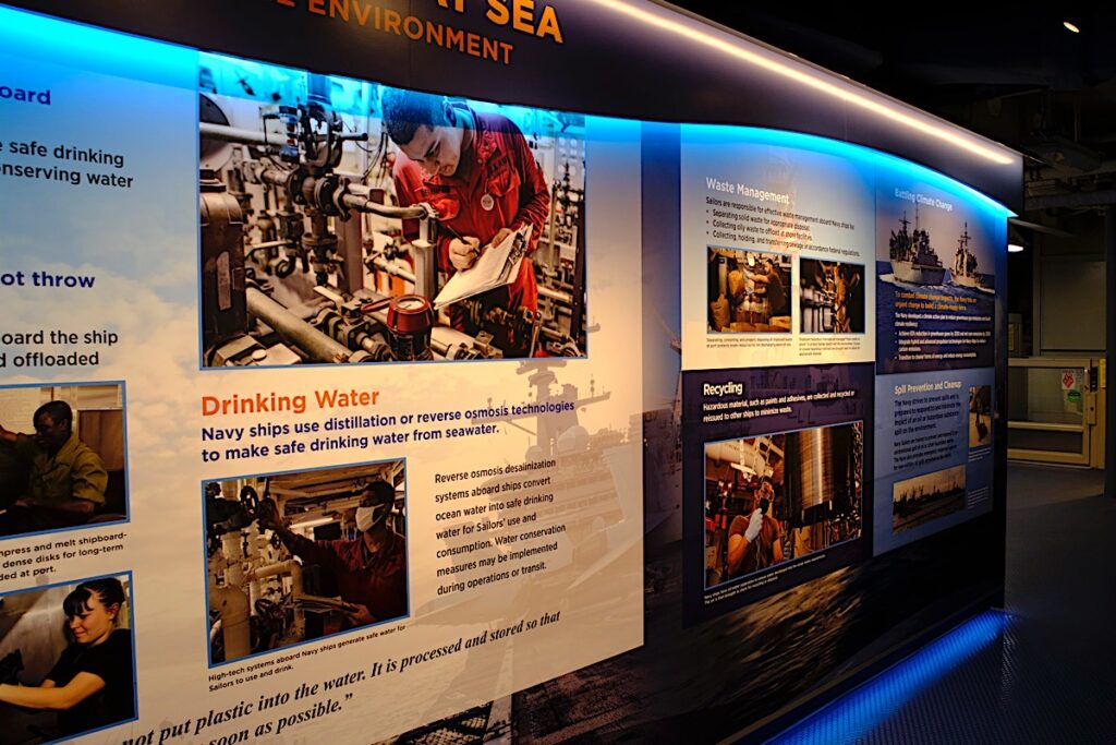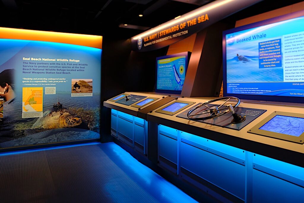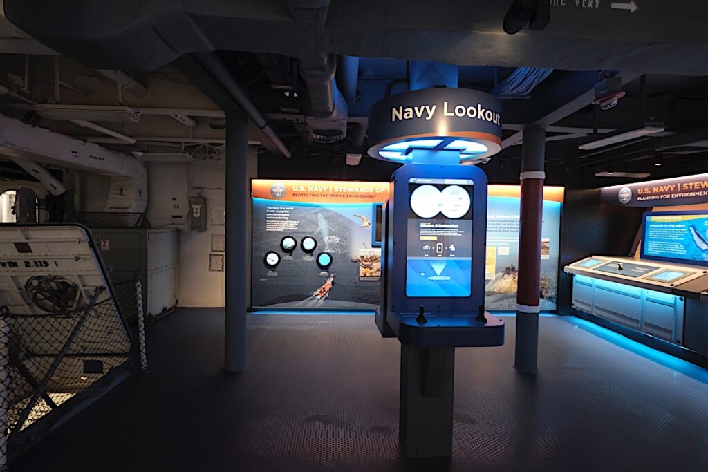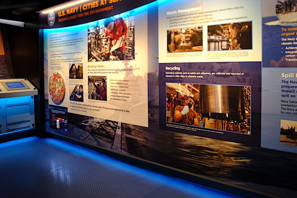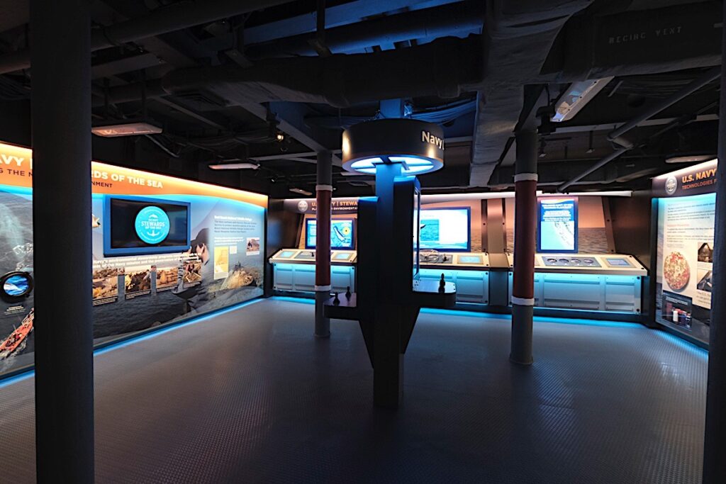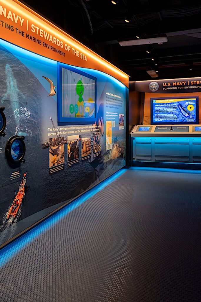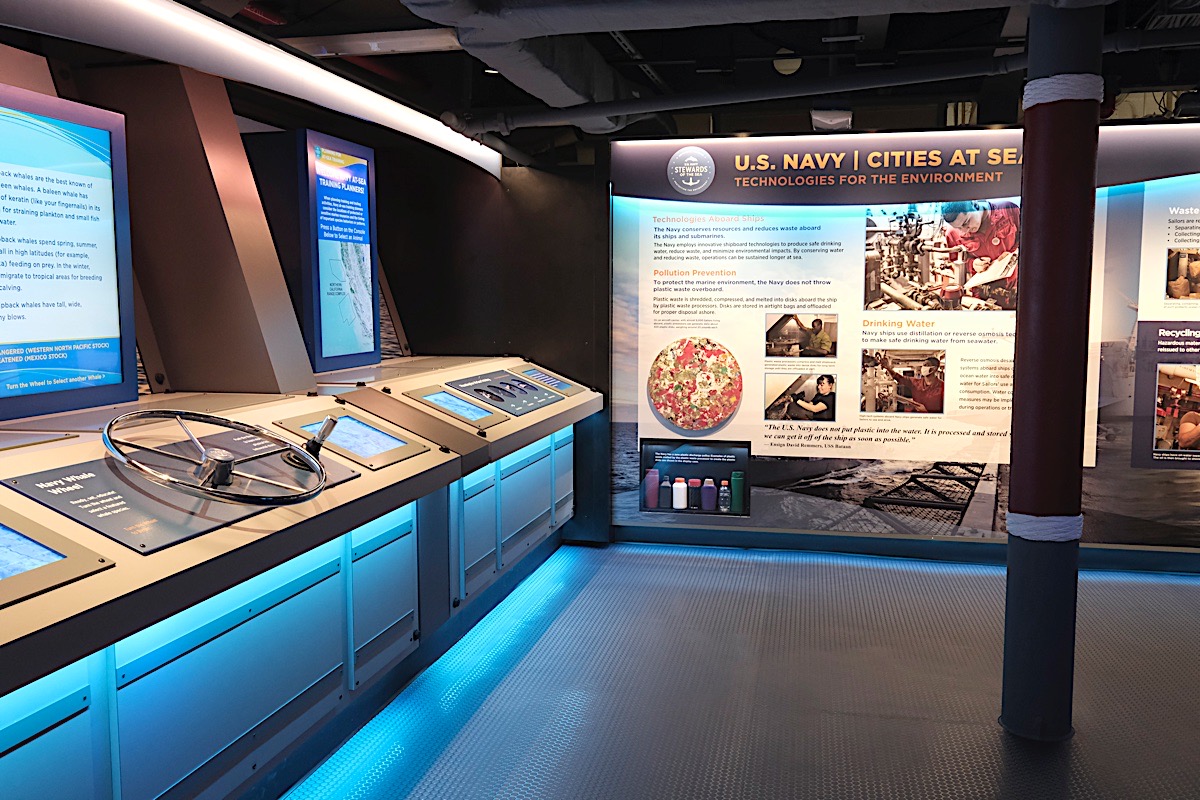 Description: The US Navy: Stewards of the Sea exhibit is an informative three-walled exhibit with full-height graphic walls, flat screen monitors, interactive hydrophone game and recycling demonstration. The exhibit documents the US Navy’s work in marine ecology, protecting sea life and ocean environments. Because the exhibit is on an actual battleship, belowdecks, selection, installation and focus of lighting instruments is more difficult than it would be in a traditional museum environment.